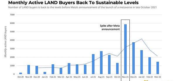 每月活躍LAND買家的數量回到了Meta在2021年10月下旬宣布之前的可持續水平。這提出了一個問題:鑒于目前只有有限的用戶能夠承載和貨幣化體驗,是什么推動了TheSandbox虛擬世界中數字土地的價值?