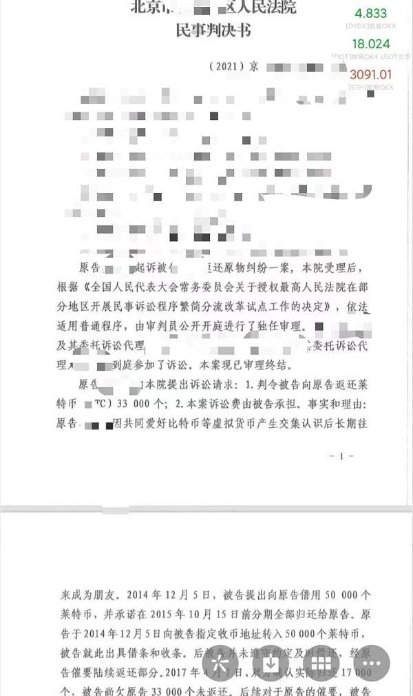 近日,北京某區人民法院公開開庭審理了一起出借萊特幣引發糾紛的民事案件。2014年12月,被告向原告提出借用50000個萊特幣,并承諾于2015年10月前分期全部歸還給原告,后原告向被告指定地址轉入50000個萊特幣,被告就此出具借條和收條,后被告并未遵守約定及時償還,經原告催要陸續返還部分。2017年4月,雙方確認實際歸還17000個,被告尚欠原告33000個未返還。后續對于原告的催要,被告以各種理由推諉拖延。2019年2月之后,被告甚至不回微信、短信。后原告訴至法院,請求法院判令被告向原告返還萊特幣33000個。