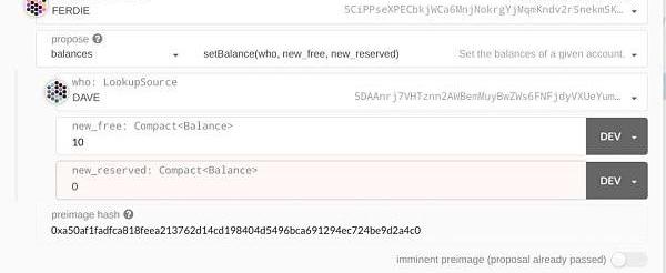 原像哈希只是要頒布的提案的哈希值。獲取原像哈希的最簡單方法是單擊“Submitpreimage”按鈕并配置你提案建議的操作。