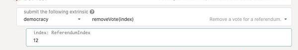 導航到Extrinsics頁面,并使用你投票時使用的賬戶提交以下外部信息:democracy.removeVote(index)。對于索引號(ReferendumIndex),輸入你投票的公投編號。