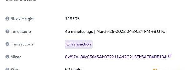 這個塊是119605,塊大小627字節,有1筆交易,但這個塊沒有交易gas費消耗。