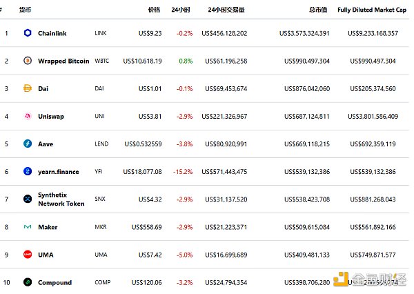 DeFi項目鎖定資產前十排名及鎖倉量,數據來源:Defi Pulse
