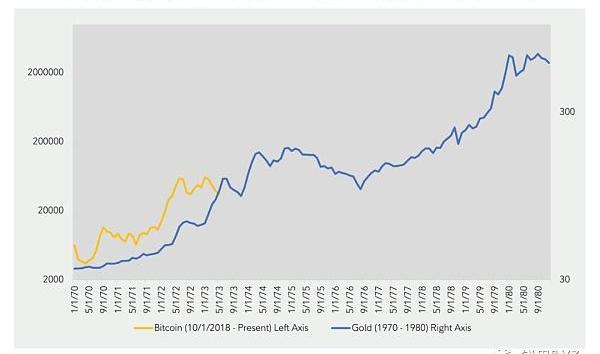 如下圖所示,黃金并沒有以一種一致的、容易預測的或低波動的方式進入這個既定的資產類別。此外,有趣的是,看看比特幣是如何大致遵循類似的模式的。但是,請注意,圖表的簡單疊加或比較不應被用作任何類型的模型或指標。我們在這里只是強調一個新興資產類別的歷史發展,它在經歷自己的價格發現過程時經歷了非常不穩定的時期。??????