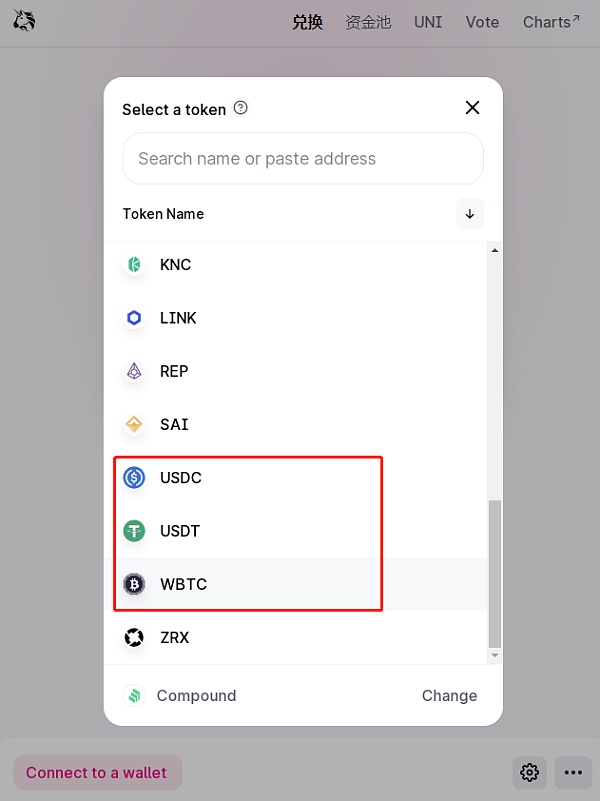 選好了Compound list之后呢,看到如下(往下拉列表,或者直接輸入DAI、USDC、USDT、WBTC)