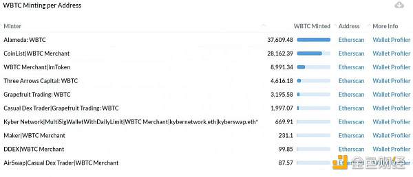 Nansen數據表示,Alameda Research也是迄今為止最大的WBTC鑄幣商,鑄造了37609個WBTC代幣。CoinList和imToken排名第二和第三,分別鑄造了28162和8991個WBTC代幣。