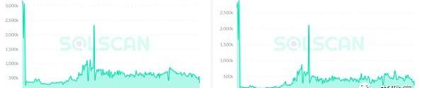 根據solscan數據顯示當前每日活躍地址數在300-500k左右波動,新增賬戶數在200-400k。