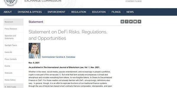 近日,美國證券交易委員會官員CarolineCrenshaw針對DeFi發表了文章:《關于去中心化金融風險、法規和機遇的聲明》作為SEC官員,其在文章中表達了對DeFi自身缺陷的擔憂:雖然DeFi提供了更多的投資機會和融資渠道,但這個不受監管的市場受到結構性限制的影響,主要表現在:投資缺乏透明度;假名制使市場容易受到難以檢測的操縱。