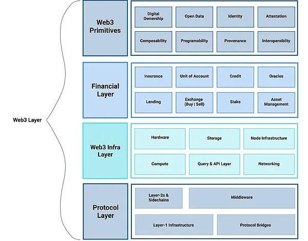 Web3基礎設施層:核心基礎設施協議和區塊鏈,負責構建元宇宙的去中心化后端,包括計算、存儲、查詢、網絡等。