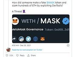 最近,在成功推出$ENS和$SOS代幣后,騙子會模擬MetaMask的治理代幣,而使用蜜罐,該智能合同允許您購買代幣,但不允許您兌現或出售投資。這里是一條關于騙子如何成功完成這一騙局的推特帖子。