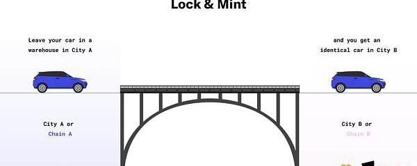 1、把你的車放在位于A市的一個倉庫里,作為交換,你會在B市得到一輛一模一樣的車。當你返回A市時,你只需要把你當初抵達B市時獲得的這輛車歸還,然后把你原來在A市的那輛車拿回去。這與區塊鏈「橋」使用的「鎖定&鑄造」機制相類似。如下圖所示: