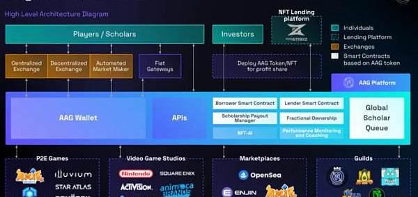 P2EPlatformAAG的愿景是希望和其他公會不是競爭關系,而是合作關系,P2EPlatform就是一個玩家、投資者、公會結合在一起的交互環境。具體包括與AGG合作的游戲庫,AAG計劃自己打造的marketplace,這個marketplace還會集成Opensea等其他市場。