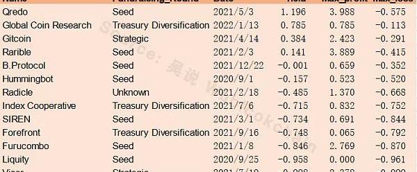 以上三個收益率均為平均收益率,其數值被部分“百倍幣”拉高,實際情況大部分都是虧損的。但一級市場就是如此,高風險高收益,因此,平均數比中位數更具參考價值。其中,有23家VC的收益率為負。其余17家中,有1家最大收益小于兩倍,有2家最大虧損大于60%。最大收益較低意味著,即使每個項目都在最高點拋出,平均收益也并不優秀;而最大虧損較高則意味著,在價格下行期間須承受極大浮虧。