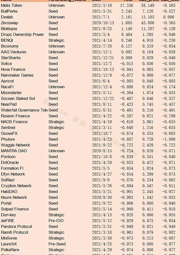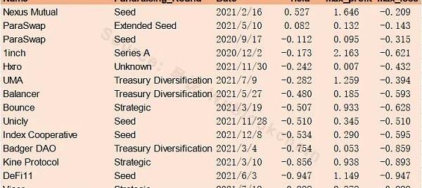 非常重要的一點是,項目token的損益不是從發行日開始算起,而是從融資信息公布日開始算。以AxieInfinity為例,該項目發行至今上漲了超過300倍,a16z與Paradigm等一眾知名VC都參與了其B輪融資,但如果按發行以來的收益率計算就會高估他們的實際收益率。事實上,B輪融資是去年10月公布的,而Axie的暴漲發生在去年夏天,如果只計算10月以來收益率,那么真實數字為-50%。