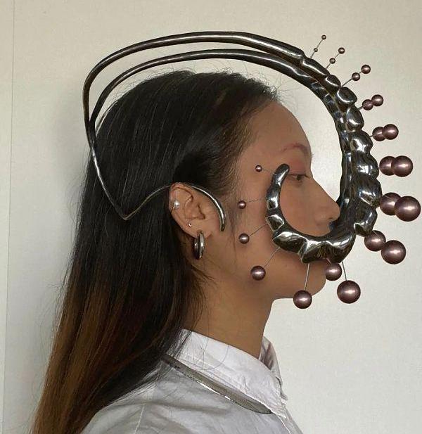 而系列中名為“ETHEOSTOMA”的作品,則是賽博朋克風滿滿的頭盔式造型。該系列在社交網絡上受到追捧,深受Z時代年輕人的喜歡。