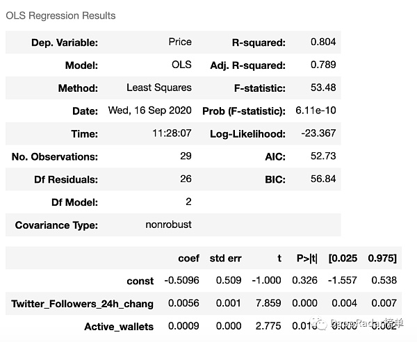 在對推特關注者和活躍錢包數進行回歸分析時,結果令人印象深刻。表明LEND價格波動的75.9%主要受到這兩個指標的影響。