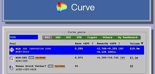 如果你覺得上面這種策略收益不夠高,則可以保留借出的MIM,并將其存入Curve上的MIM池。在獲得0.25%APY的基礎上,還能獲得CRVToken,APR最高9.35%,外加APR0.13%的SPELLToken。