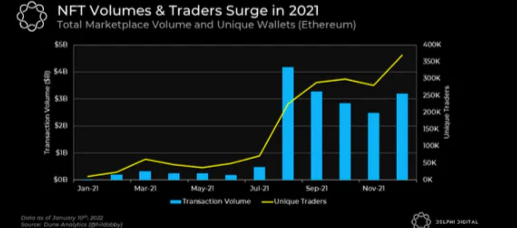 NFT在2021年起飛,雖然NFT已經存在了很久,但2021年是它們進入主流話題的一年,像OpenSea這樣的市場平臺也迎來了爆炸式增長。NFT市場吸引了很多傳統公司和名人入局。NFT也在2022年迎來火熱開局,2022年1月是NFT交易量和數量表現最好的一個月,買家對新項目的興奮度仍然非常高。