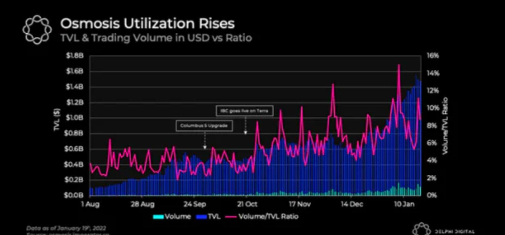 支持IBC的DeFi:CosmosHub將會有眾多競爭Hub,如Evmos、Archway和Juno,它們提供與CosmosHub不同的價值主張,可以進一步刺激CosmosDeFi。事實上,Osmosis已經與CosmosHub競爭,在過去的30天里,它促進的IBC轉賬次數是CosmosHub的2倍以上。DelphiDigital認為,Cosmos賽季將使市場大到足以讓玩家共存。Osmosis正在處理Cosmos-nativeDeFi,而THORChain選擇不加入IBC而支持Asgard,它仍有一個巨大的市場可以利用原生BTC和其他資產。