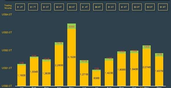 現貨交易量在年初激增,與市值的增?相匹配,但在5?的下跌后逐漸減弱。?