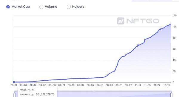 根據nftgo.io的數據顯示,2020年1月1日至2021年1月11日,NFT市值從2762萬美金增長至6174萬美金,年增長率為124%。