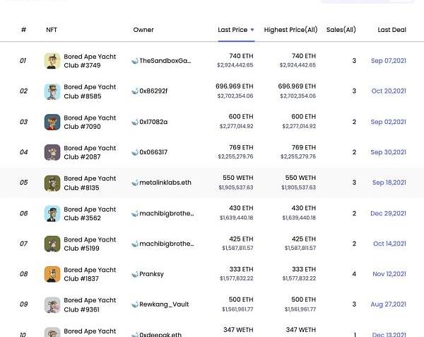 截止2021年12月30日,BoredApeYachtClub最高成交價的NFT作品是《BoredApeYachtClub#3749》,最新以740ETH成交于2021年9月7日。