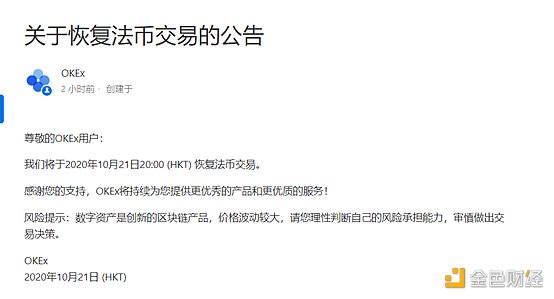 XRP/HKD+1.18%10月21日上午,OKEx發布公告指出,恢復法幣交易。