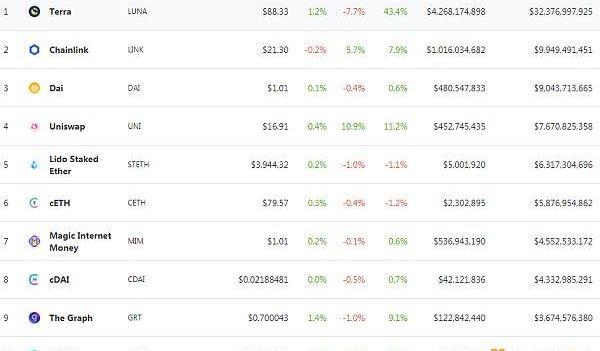 DeFi項目鎖定資產前十排名及鎖倉量數據來源:defillama