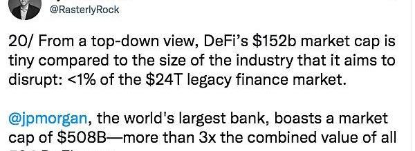 Bitwise研究分析師RyanRassmusan在推特上發帖稱:“摩根大通是世界上最大的銀行,其市值約為5080億美元,是所有DeFi應用程序總和的3倍多。與其旨在顛覆的行業規模相比,DeFi微不足道:24美元傳統金融市場的1%。”