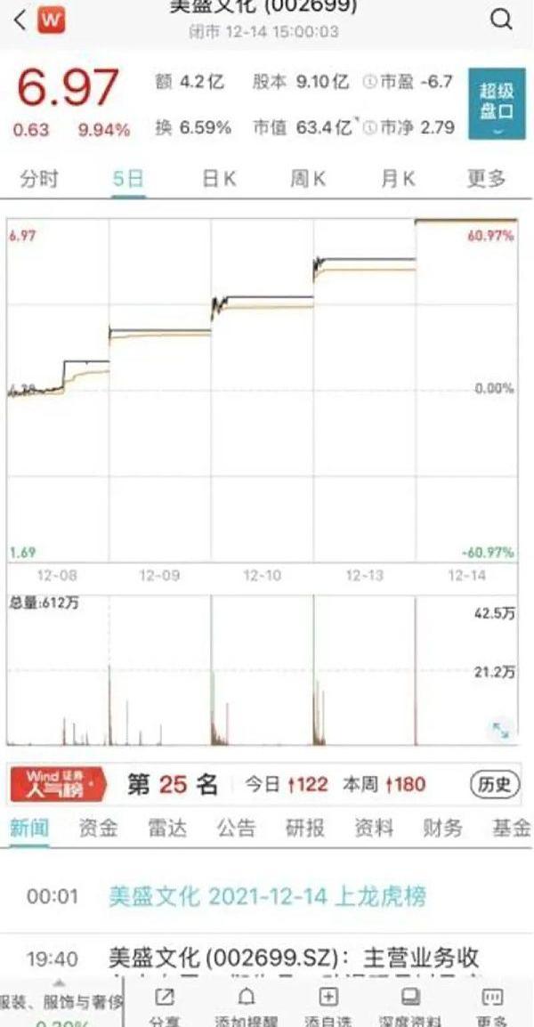 XRP/HKD+0.11%12月14日,元宇宙小龍頭美盛文化再度漲停,連板數量達到5個。