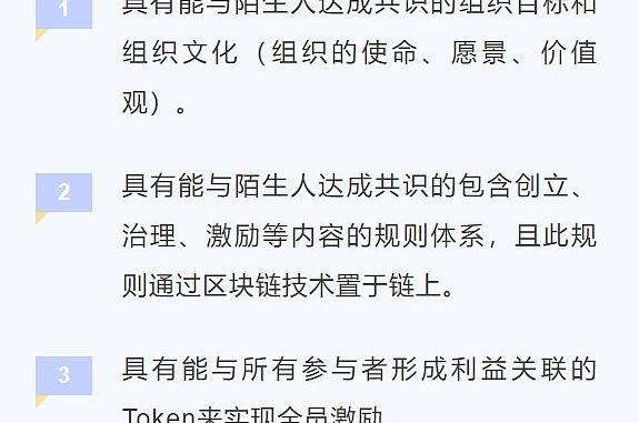 對于DAO來說,區塊鏈可以充當主干,保持每個鏈上的結構和規則。一個DAO的誕生,必須具備三個基本要素: