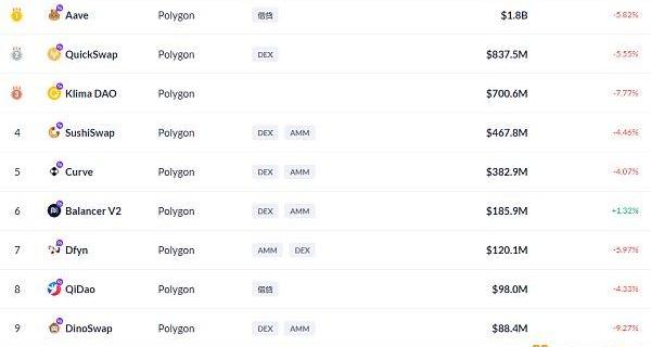 Polygon鏈上DeFi鎖定資產前十排名及鎖倉量,數據來源:Debank
