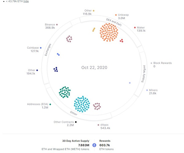 截至10月22日,目前有350萬枚ETH(超過以太坊總量的3%)每天通過發送到Uniswap為代表的DeFi應用之中——僅Uniswap接受的ETH數量,就已然比所有CEX的總和還要多。