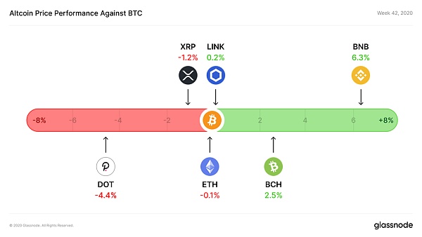 在第42周,主流山寨幣對比特幣的表現再次出現參差不齊的狀況。ETH與BTC持平,BCH漲幅領先3.5%,BNB漲幅6.3%。