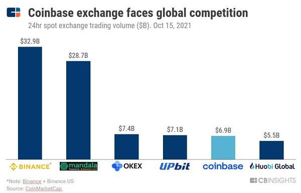 Coinbase面臨著來自許多合法加密交易所的直接競爭。Bitfinex、Bitstamp、Kraken和bitFlyer是Coinbase的主要競爭對手,還有像Robinhood這樣的傳統經紀公司。同時,Coinbase也將加密交易業務擴展到了全球42個國家/地區,包括美國、加拿大、印度、巴西和韓國。因此,該公司現在也與交易量最大的交易所「幣安」競爭。