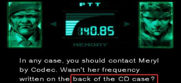 發售于1998年的《潛龍諜影》初代,在游戲流程初期的一場Boss戰結束后,情節推進到需要聯絡潛伏在敵方內部的內應人員;然而,攸關后文展開的無線電聯絡頻率,卻在這時莫名其妙地遺失了,怎么辦?