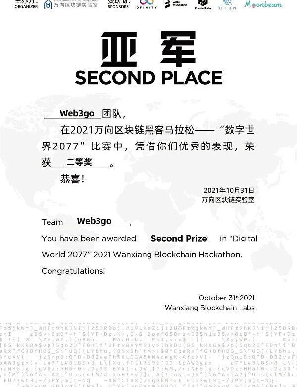 太上NFT卡包-太上NFT渲染器和Web3go兩支團隊榮獲大賽二等獎,每支隊伍獲得主辦方提供的30000元人民幣獎金。太上NFT卡包-太上NFT渲染器致力于對數字權益的鏈上/鏈下解析器這一基礎設施進行完善,同步開發連接解析器的、基于Scaffold-Eth的太上數字權益卡包,面向Loot、n(N)等新一代數字權益范式,發掘數字權益的無限可能。Web3go作為一個開放的數據平臺,專注于對Polkadot、Ethereum等生態中產生的鏈上數據進行同步追蹤、篩選和格式化,最終以可視化圖表展示出來,同時平臺提供了對數據共享和業務協作的工具支持。