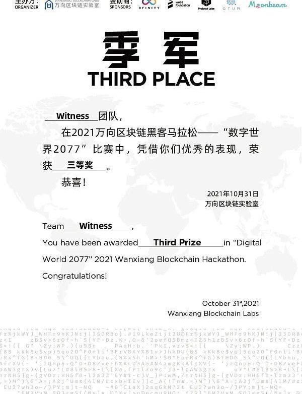 Walnut、AmaraLink、Witness三支團隊榮獲大賽三等獎,分別獲得10000元人民幣的獎勵!Walnut團隊的Nutbox是一個Web?3.0時代的DAO操作系統,通過Nutbox,社區可以自行創建DAO平臺并將Nutbox中的內容、數字權益等元素部署到自己的DAO中。AmaraLink是一個支持多重簽名閾值技術的數據跨鏈橋,致力于成為鏈接Polkadot和其他鏈的樞紐。目前,AmaraLink正積極開發Moonriver及Polygon/Ethereum之間的跨鏈橋。Witness是一套鏈下投票治理解決方案,可以幫助投票者在不披露個人身份的情況下參與治理,在Web3.0時代,為dApp在不同區塊鏈上提供治理空間。