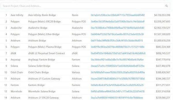 與之前看到的全紫色相比,這次橋上的平衡分布得更好。Polygon的份額從大約90%下降到約30%。事實證明,AxieInfinity遷移到他們的Ronin側鏈已被證明是一個巨大的成功,活動的爆炸式增長和AXS代幣價值使他們獲得了25%的橋鎖價值。Avalanche和Arbitrum位列前四。