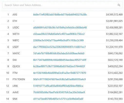 作為存入AxieInfinityRonin的主要代幣,AXS沖到了榜首。Ether跌至第二位,WETH出現在第四位,部分原因是有幾個新橋接受了它而不是Ether。AAVE的總量下降了,這是一個有趣的發現,因為它在Polygon中被廣泛使用,并且是AvalancheRush的主要合作伙伴。用戶可能一直在等待Avalanche的啟動。