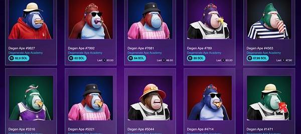 一個名為TheDegenerateApeAcademy的項目已經在Solanart上處理了超過950,000個Solana,按當前價格計算,相當于1.49億美元。在OpenSea上,似乎交易了價值約1.9ETH的DegenerateApes。?