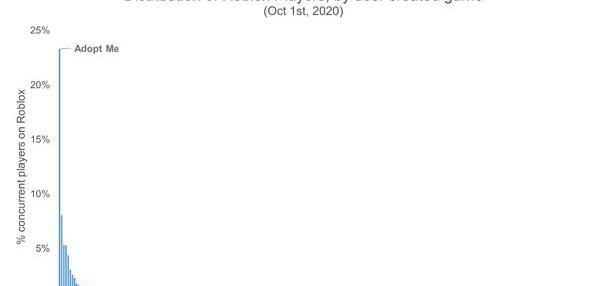 即使在游戲領域,成功也越來越集中于少數游戲創作者。根據EA產品經理RanMo的文章,在Roblox上,即使總使用量增加,頂端的集中度也在增加:2018年,Roblox上的頂級游戲占并發用戶的8-10%,而在2020年,頂級游戲占并發用戶的20%至25%以上。他提出了這種集中的兩個原因:缺乏參與游戲的上限,以及游戲的社會性質導致了贏家通吃的網絡效應。