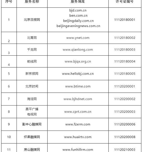 北京市獲得互聯網新聞信息服務許可的互聯網站名單