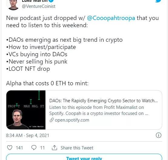 同樣,Soleimani?談到了?CooperTurley?(@Cooopahtroopa),MolochDAO曾出錢讓Cooper?寫一篇年終博客。現如今,Cooper已經成為了?FireEyes和FriendsWithBenefits等DAO組織的關鍵人物。?