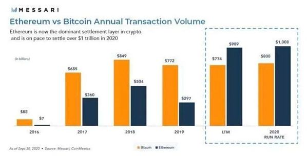 由于以太坊生態DeFi應用在今年一發不可收拾,以太坊開始擔下全球去中心化金融的結算層的角色。我們看到USDT不斷從比特幣網絡向以太坊網絡轉移,而在10月23日消息,加密貨幣數據提供商Messari最新發布的報告顯示,近期以太坊網絡處理的交易量已超過比特幣網絡兩倍多,以太坊超越比特幣成為最大的結算層,成為首個年結算超1萬億美元的公鏈。