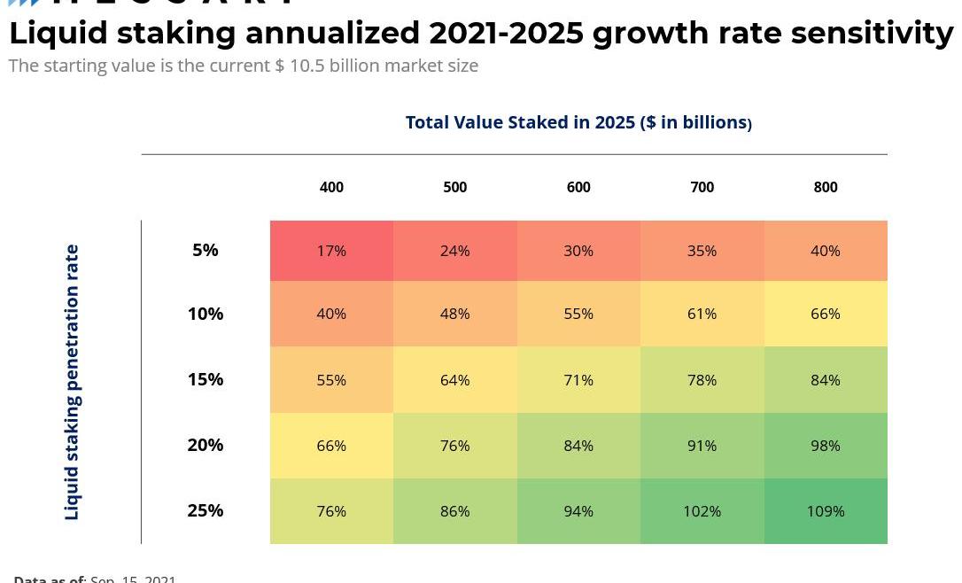 假設到2025年,staking年獎勵達到400億美元,平均staking收益率在5%-10%之間,這意味著總的質押代幣市值將在4000億-8000億美元之間。所有質押代幣當前的市值約為1460億美元,而當前鎖定在DeFi中的總價值為1860億美元。很明顯,隨著以太坊等加密網絡向權益證明共識機制的大規模轉變,流動staking可能會迎來一波相當大的市場增長。