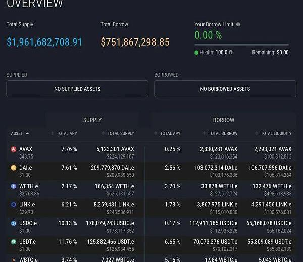 該協議目前支持AVAX、wETH、wBTC、LINK、DAI、USDC和USDT的存款和借貸。必須認識到,根據資產的不同,儲戶的收益率在2.20-11.76%之間,收益率由利息和代幣獎勵的組合組成。另一方面,借款人可以獲得0.24%至6.80%的凈APY。這意味著農民可以通過借款獲得報酬,并實現各種不同的策略。