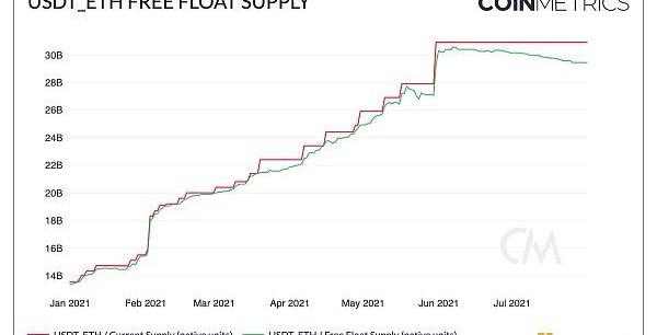 伴隨著Tether的總供應量增長停滯不前,其自由流通供應量在上個月有所減少。“自由流通”供應量是由CoinMetrics開發的一種指標,不包括被視為非流動性的供應量。Tether自由流通供應量的減少代表已被贖回并送回Tether儲備的供應量。這種自由流通量的減少在以太坊上尤為明顯——在過去30天內,以太坊上發行的Tether(USDT_ETH)的自由流通供應量減少了約10億,而總供應量保持不變。