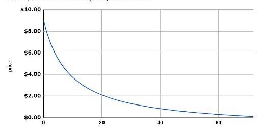 圖一:在交易池中不斷調整的各資產比例,發售token:接受token由開始的90%:10%在三天時間內按每小時1.11%的速率逐漸調整為10%:90%
