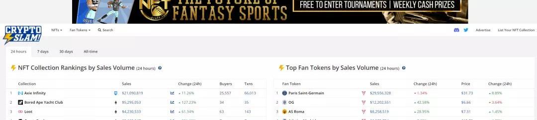 年中,NFT游戲AxieInfinity的銷售暴漲,據CryptoSlam數據顯示,截止8月7日,NFT游戲項目AxieInfinity累計交易量突破10億美元,在NFT市場中按成交量計算位列首位。AxieInfinity的迅速上漲帶動整個NFT市場板塊的快速發展。