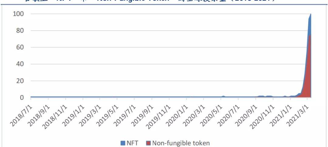 從2021年2月開始,NFT開始爆炸式增長,每周交易量超過200萬美元,截至到5月,在不到三個月的時間里,大型NFT項目的總市值增長高達2000%,熱度甚至超過DeFi,從下面一組數據可見一斑:?2.1Google搜索量在2021年呈爆發式增長。?根據GoogleTrends顯示,關鍵詞“NFT"和“Non-FungibleToken”全球的搜索量在2021年劇增,這也意味著NFT生態系統的關注度在不斷攀升。這一部分轉化成供需,繼續擴寬NFT的規模。